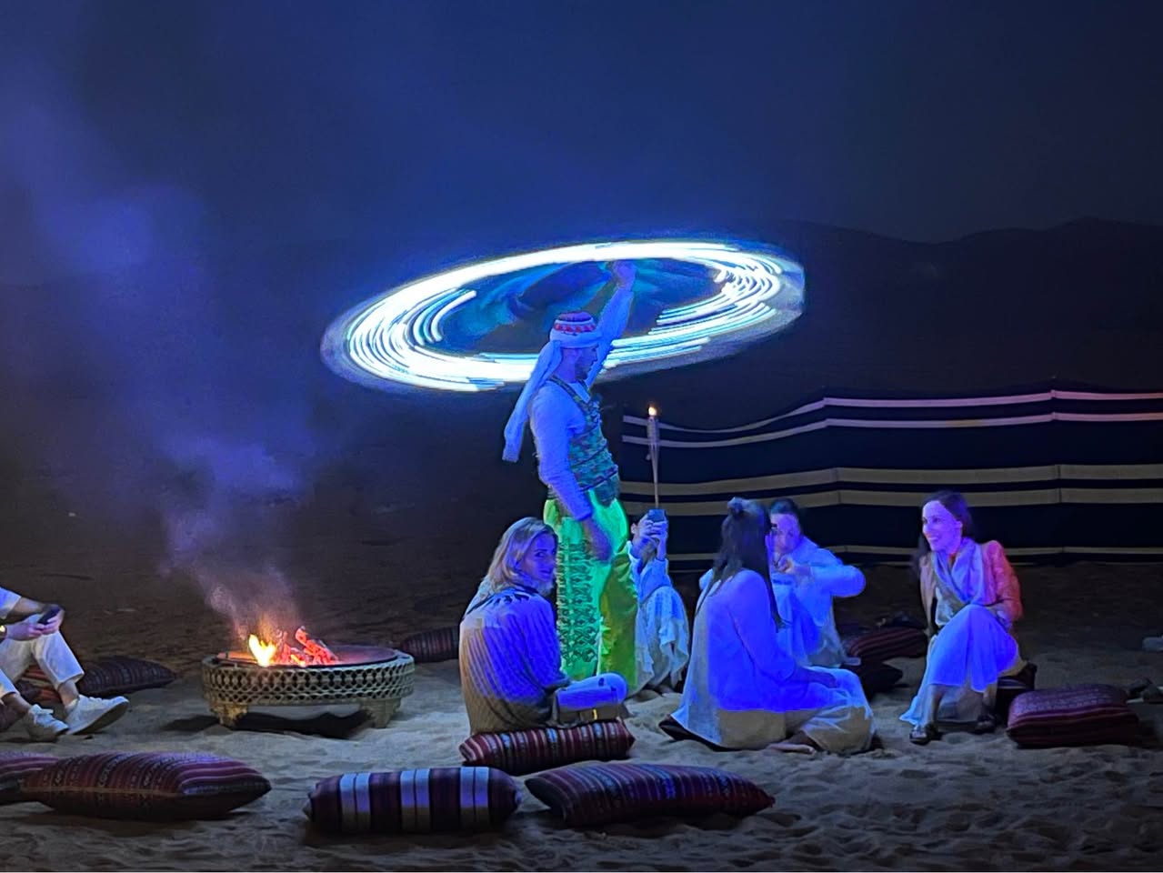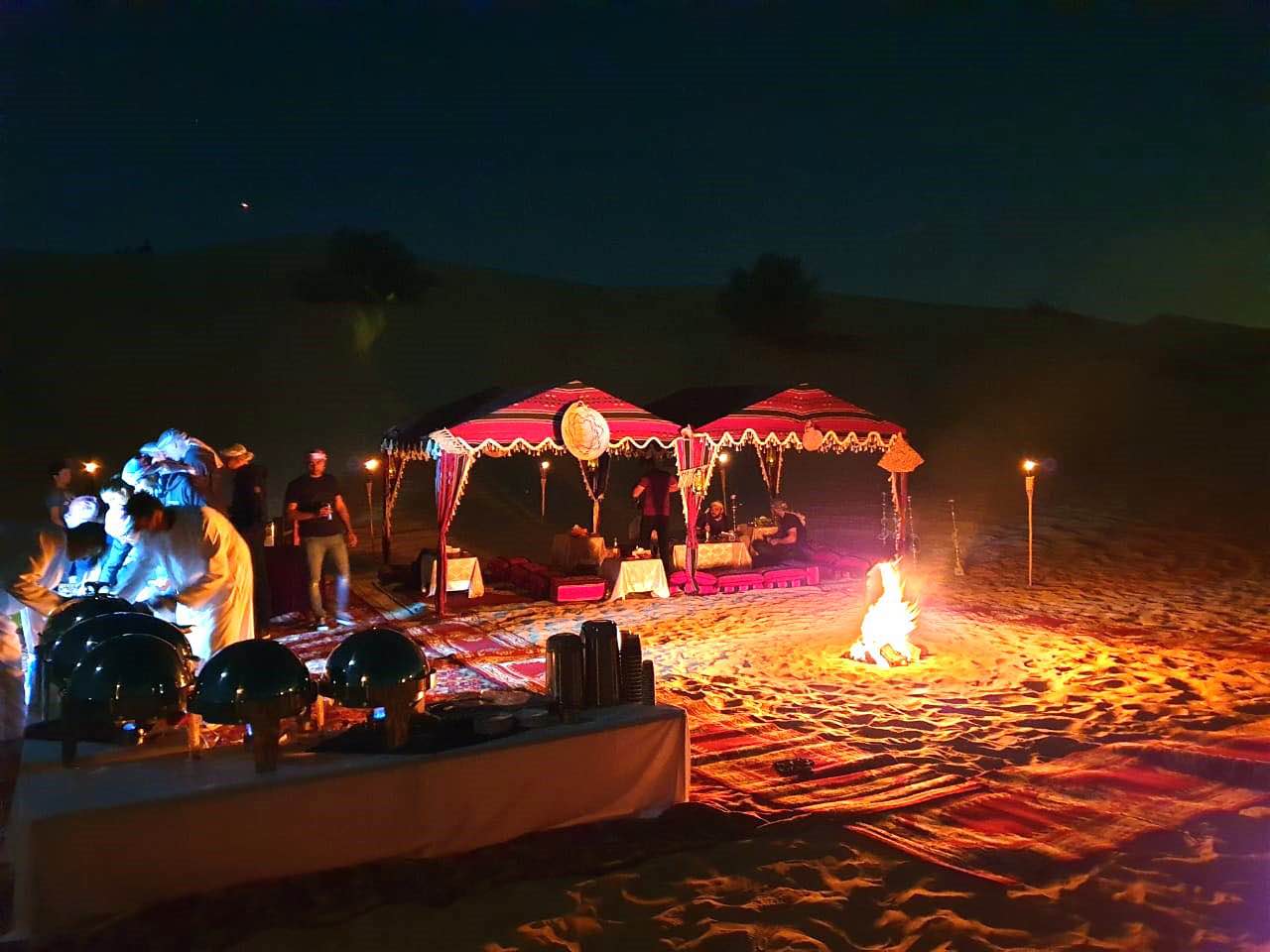 At the desert camp, you’ll find authentic Arabic hospitality — unlimited soft drinks, tea, coffee, and a buffet BBQ dinner with both vegetarian and non-vegetarian dishes. The evening includes live entertainment and a relaxed desert ambiance.
